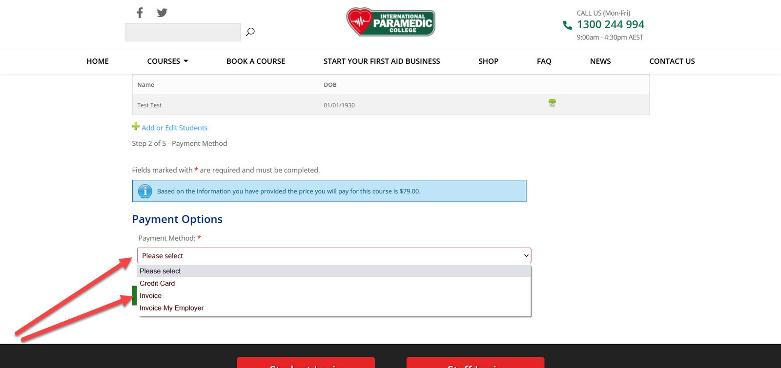 Select payment method: Under Payment Method you have the choice to pay by ‘Credit Card’ ‘Invoice’ or ‘Invoice My Employer’